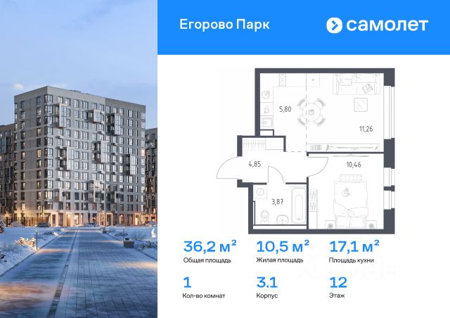 Общая площадь: 41.20 м.кв., Жилая площадь: 17.30 м.кв., Площадь кухни: 10.40 м.кв.