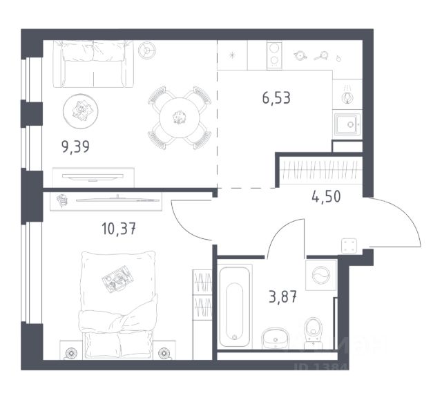 Сейчас комната и кухня составляют единое пространство, но по замыслу застройщика они могут быть разделены стационарной или раздвижной перегородкой.