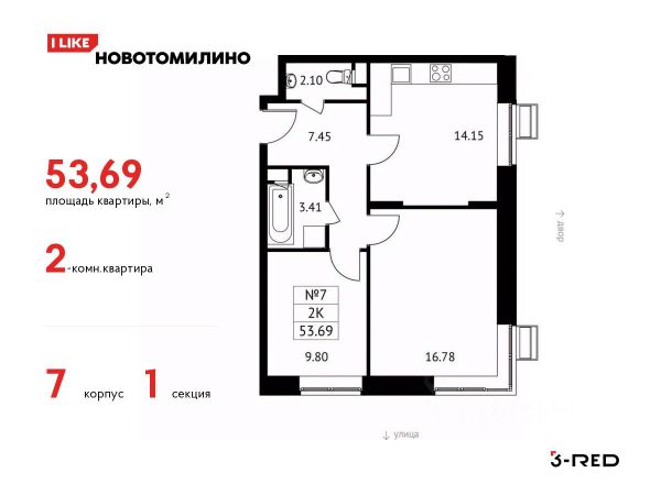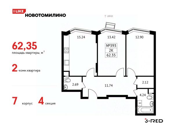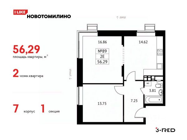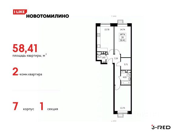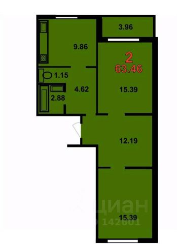 Общая площадь: 61.40 м.кв., Жилая площадь: 31.00 м.кв., Площадь кухни: 9.90 м.кв.