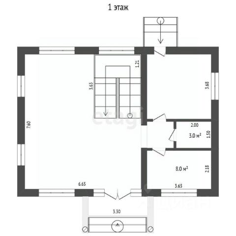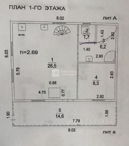 1 этаж: крытая терасса 14,6 кв.м., кухня-гостиная 26,5 кв.м., спальня 8,3 кв.м., санузел 7,9 кв.м.