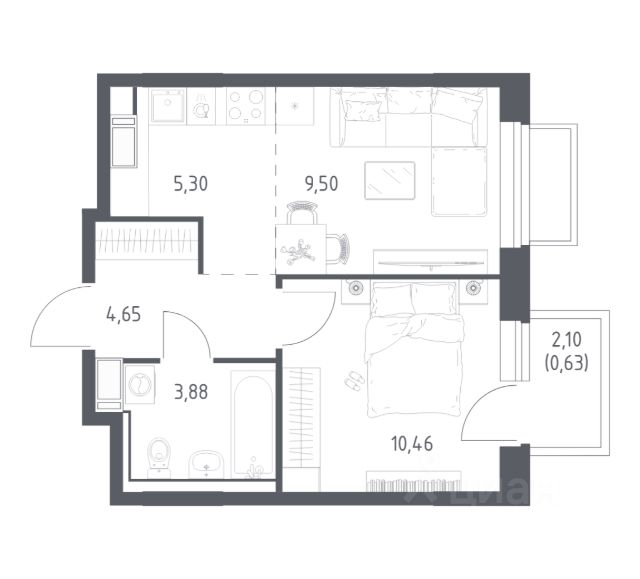 Общая площадь: 63.46 м.кв., Жилая площадь: 30.78 м.кв., Площадь кухни: 9.86 м.кв.