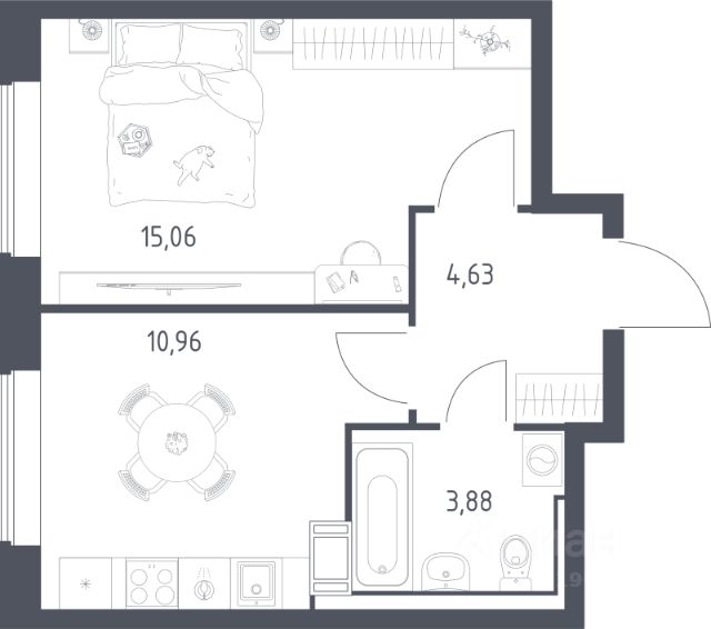 Общая площадь: 43.00 м.кв., Жилая площадь: 18.00 м.кв., Площадь кухни: 11.00 м.кв., Квартира переделана из 1-комнатной в 2-комнатную