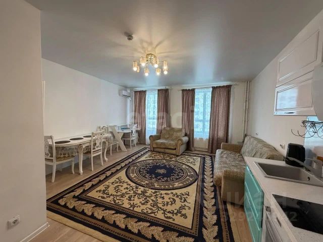 Кухня-гостиная. Матовый темно синий кухонный гарнитур икеа, встроенный холодильник beko, посудомойка beko, кран с фильтром для питьевой воды гейзер, электрическая плита hansa, духовка bosch, кондиционер zanussi, вытяжка. большое количество розеток, желтые двери с замками , новые батареи, стены и потолок окрашены, на полу ламинат. Окна с москитной сеткой, тканевыми жалюзи, выходят на гору (ул. Юности ), на потолке два светильника, в кухонном гарнитуре встроенная подсветка. Каменная столешница.