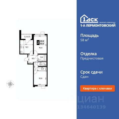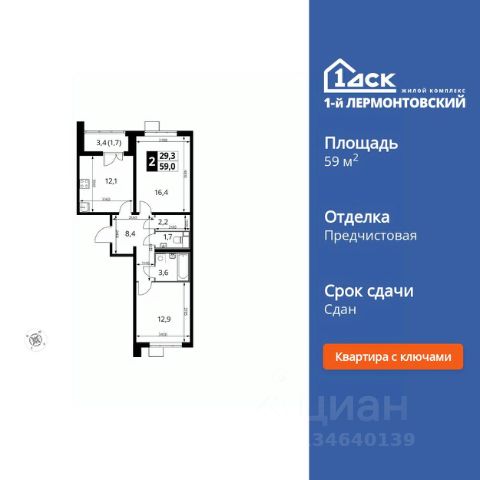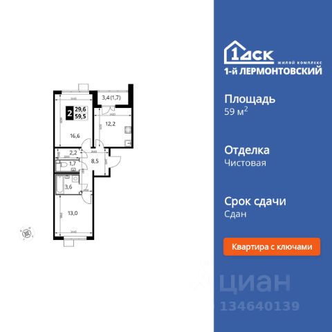 Продаётся 2-к квартира номер 744 общей площадью 59.1 кв.м. на 4-м этаже 24 этажного здания. Отделка Whitebox. Цена с учётом скидки.