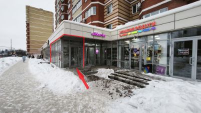 Вход в помещение рядом с остановкой общественного транспорта и пешеходным переходом.Витринные окна, место для рекламы.В соседних помещениях супермаркет "ДИКСИ", супермаркет "Первый выбор", аптек...