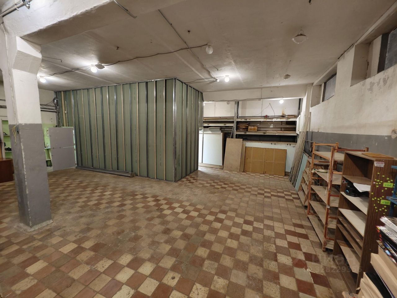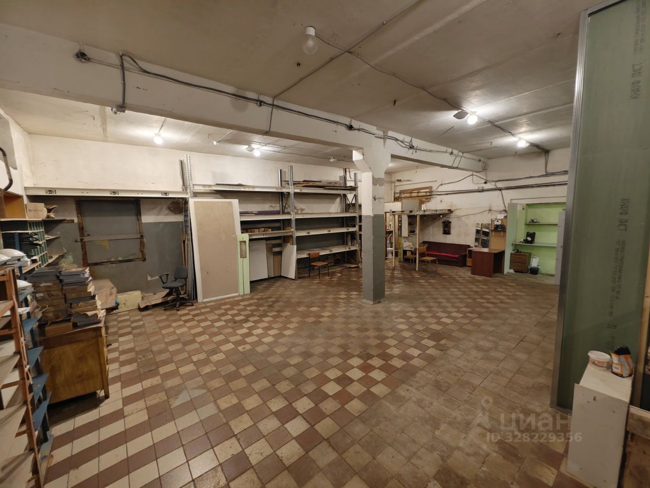 Бетонный пол, высота потолков 5 метров — хватит места для стеллажей и оборудования.