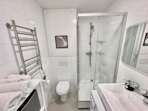 - Душевая кабина, стиральная машина, полотенца, шампунь, гель для душа, зубной набор, фен