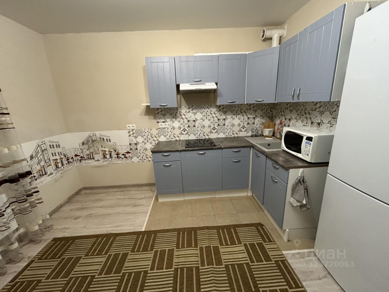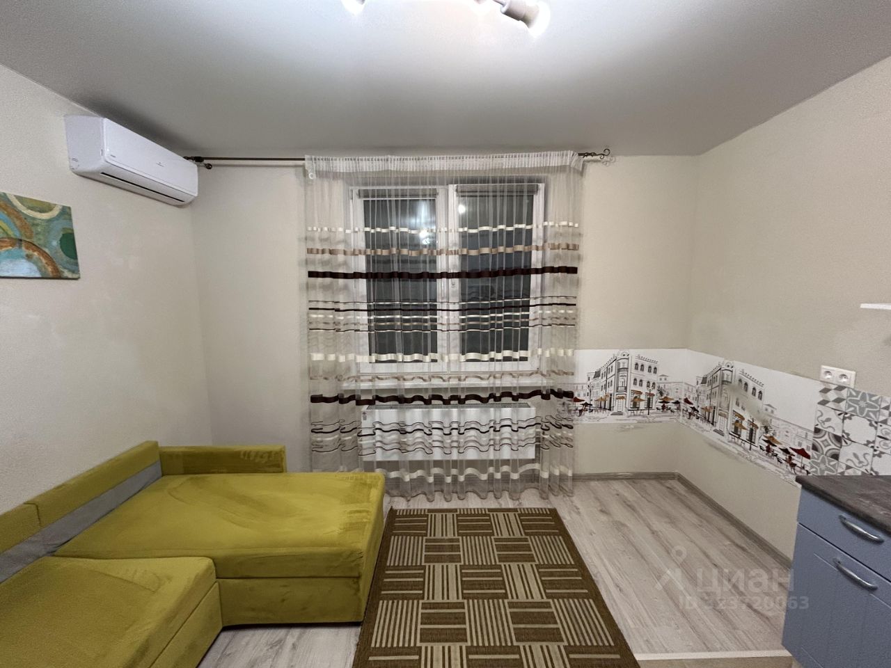 В квартире сделан ремонт. Есть всё необходимое для жизни: удобная мебель на кухне и в комнате, а также современная техника — кондиционер, холодильник и стиральная машина, микроволновая печь. Есть минимальный столовый набор: вилки, ложки, ножи, кастрюли. Единственное нет чайника и обеденного стола и стульев.