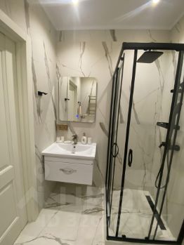 Совмещённый санузел выполнен в современном стиле с душевой кабиной и качественной сантехникой. В квартире сделан свежий евро ремонт.