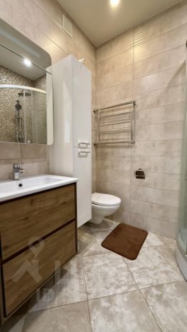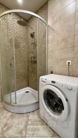 Ванная комната выполнена в современном стиле и включает в себя: душевую кабину с тропическим душем, шкаф напольный, большую тумбу с раковиной, шкаф навесной с зеркалом и подсветкой, подвесной унитаз, стиральную машину. Установлен теплый пол.