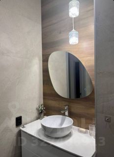 Органично продуманный санузел: встроенная инсталляция, ванная, тумба с накладной раковиной, разноуровневый свет, зеркало с подсветкой. Полы с подогревом.