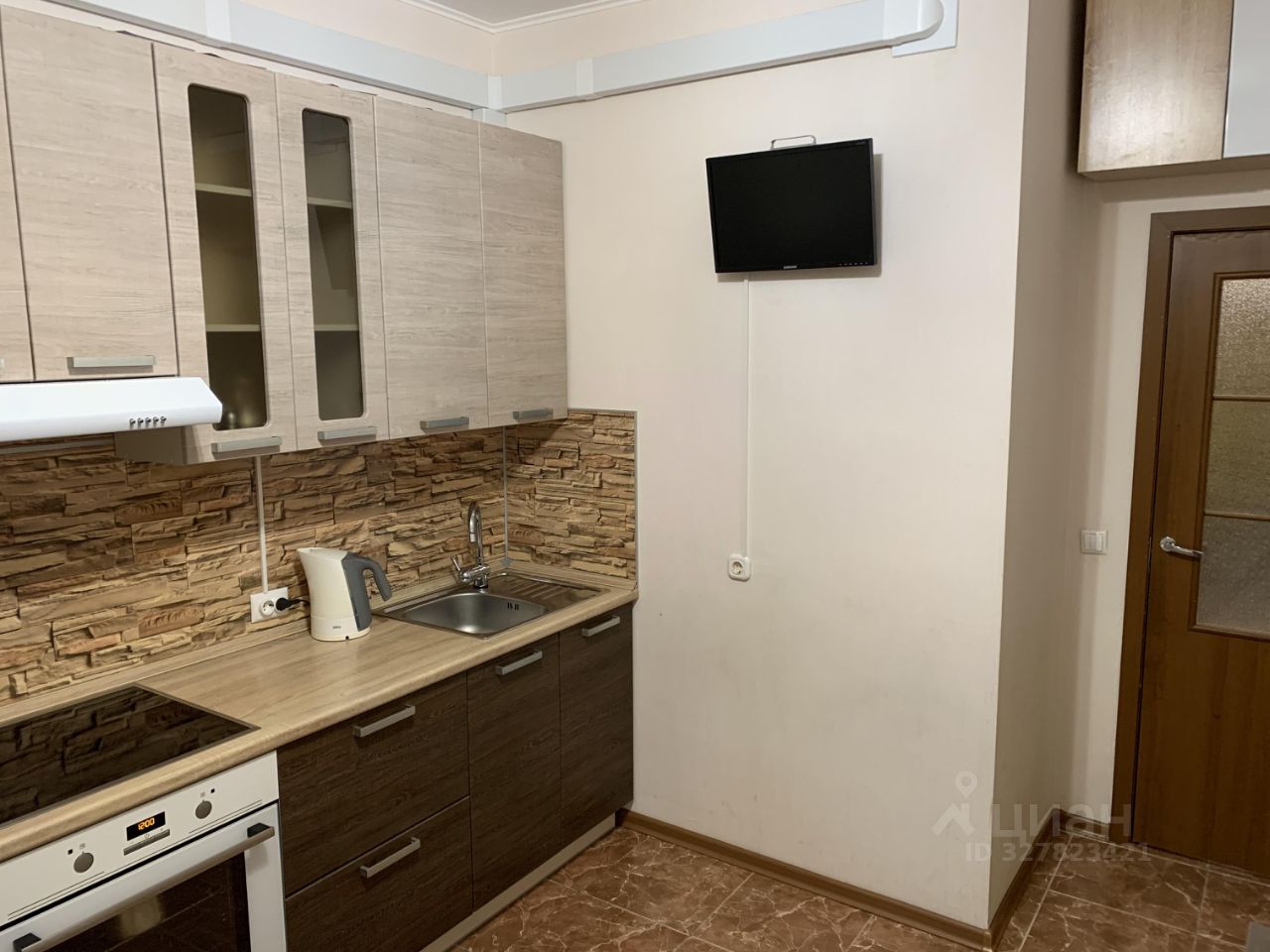 Есть необходимая техника: двухкамерный холодильник, стиральная машина, варочная панель, духовой шкаф, чайник, телевизор на кухне.