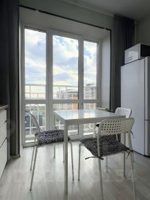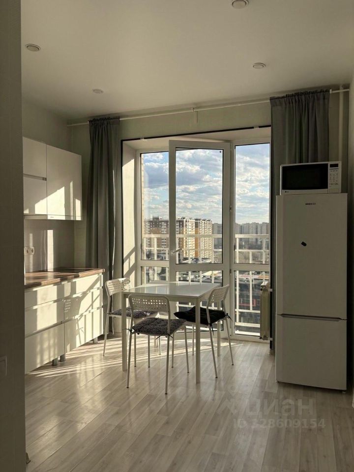 В квартире выполнен косметический ремонт. Просторная кухня площадью 8 м² оснащена необходимой бытовой техникой, включая холодильник и микроволновую печь. Из окон открывается приятный вид на город.