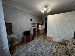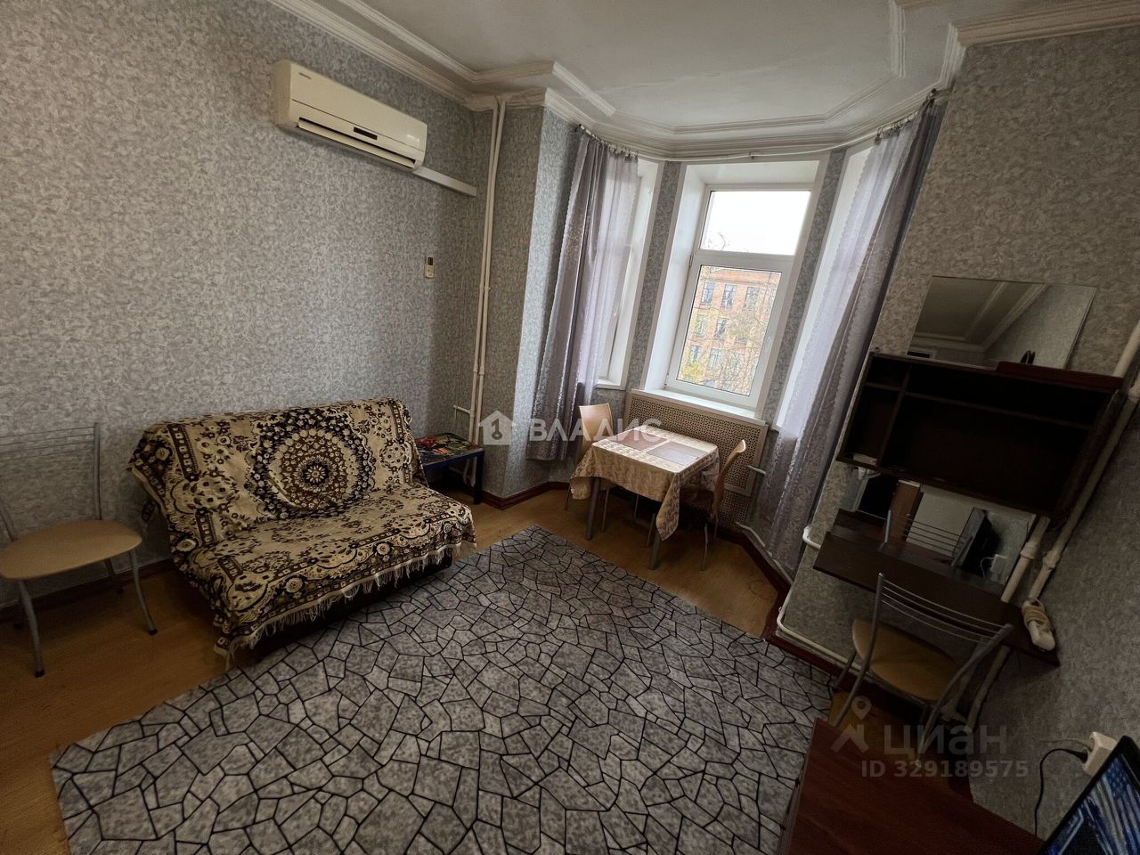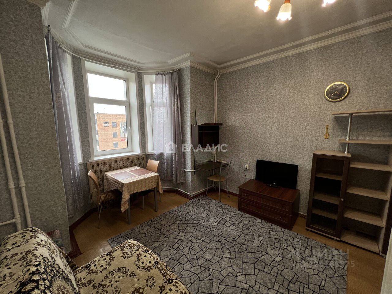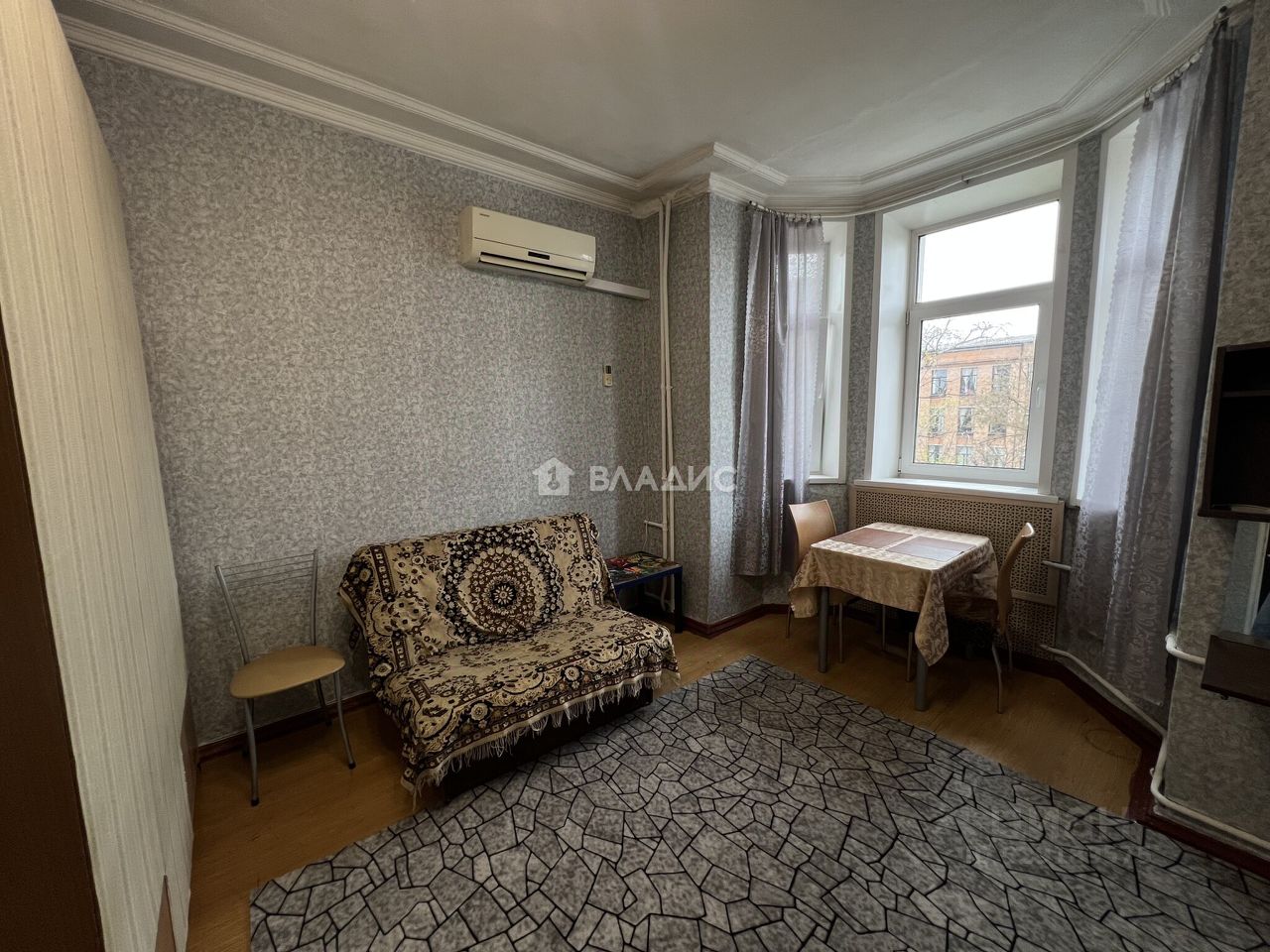 Комната площадью 24 кв. м с высокими потолками (3,1 м) и окнами, выходящими на улицу.