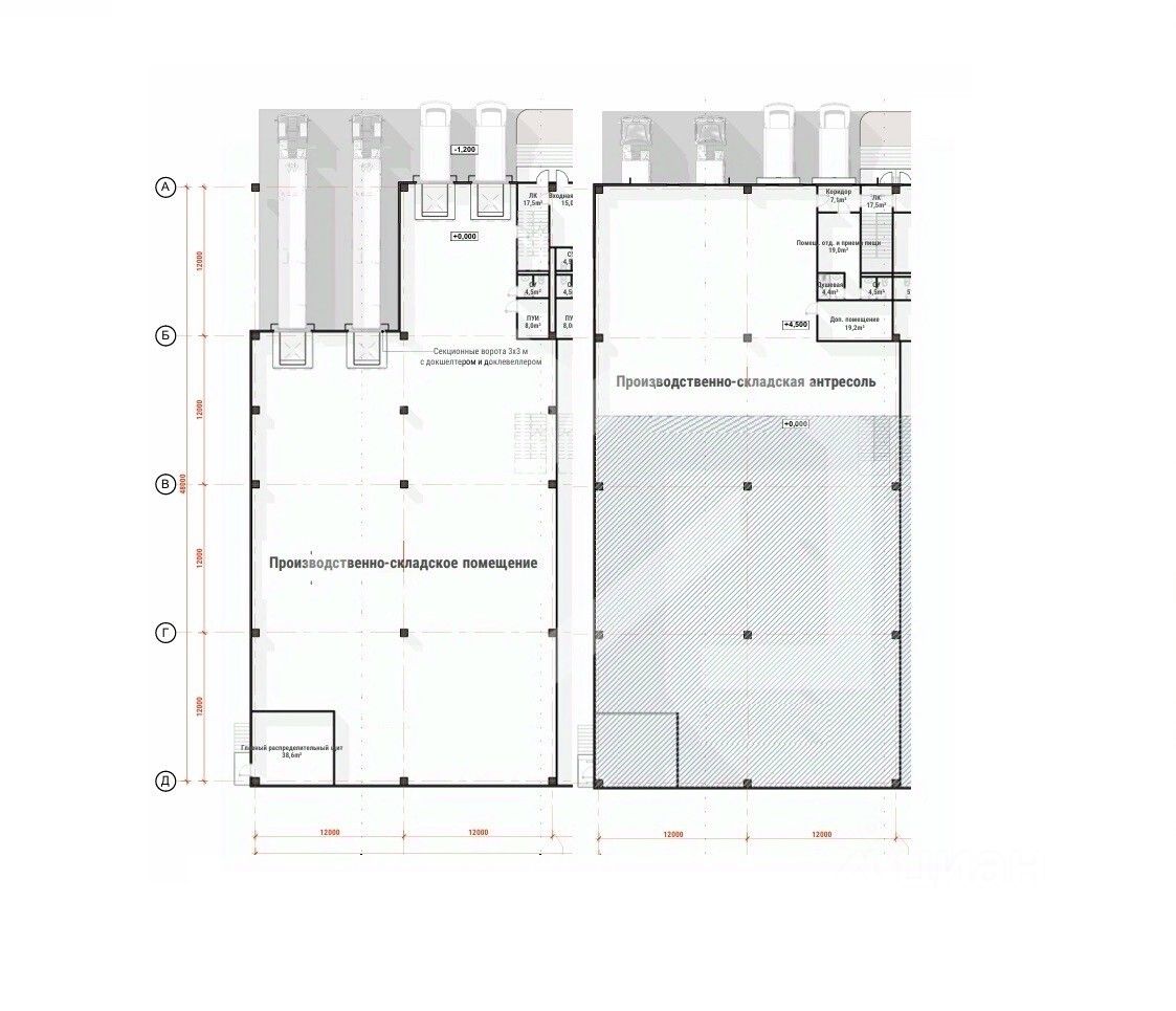 Высота потолков: 10 м + антресоль 4,5 м.