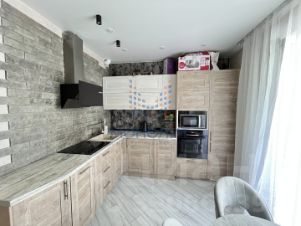 Просторная кухня с кухонным гарнитуром и встроенной техникой .