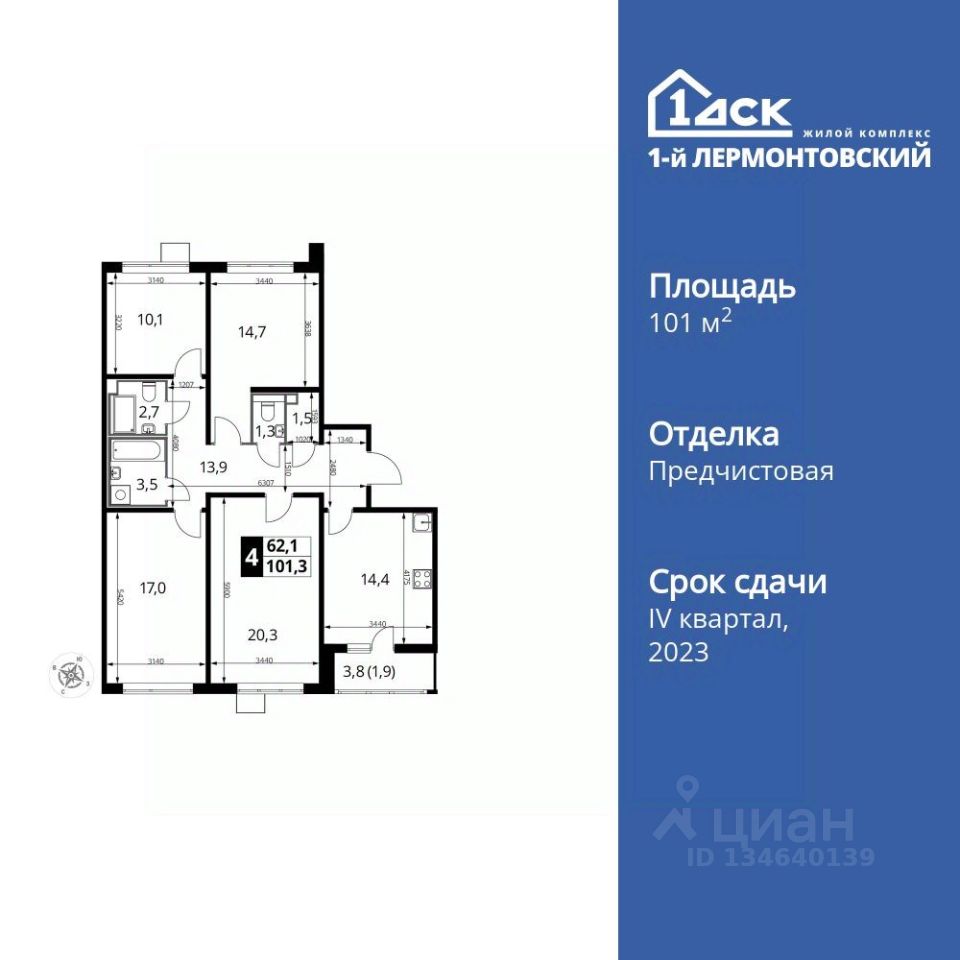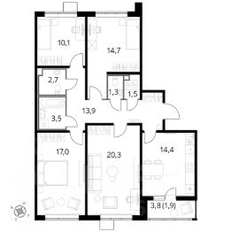Продаётся 4-к квартира номер 633 общей площадью 101 кв.м. на 13-м этаже 25 этажного дома. Отделка Whitebox.