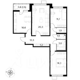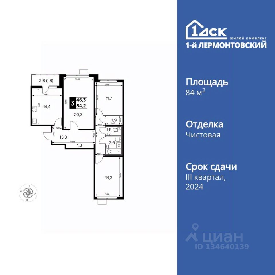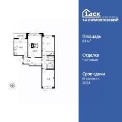 Продаётся 3-к квартира номер 146 общей площадью 84.2 кв.м. на 22-м этаже 24 этажного дома. Чистовая отделка.
