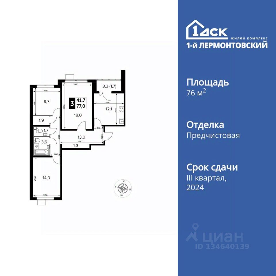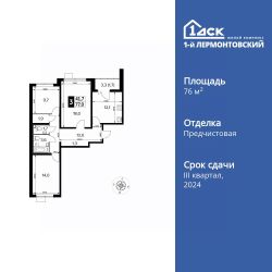 Продаётся 3-к квартира номер 365 общей площадью 76.9 кв.м. на 6-м этаже 24 этажного дома. Отделка Whitebox.