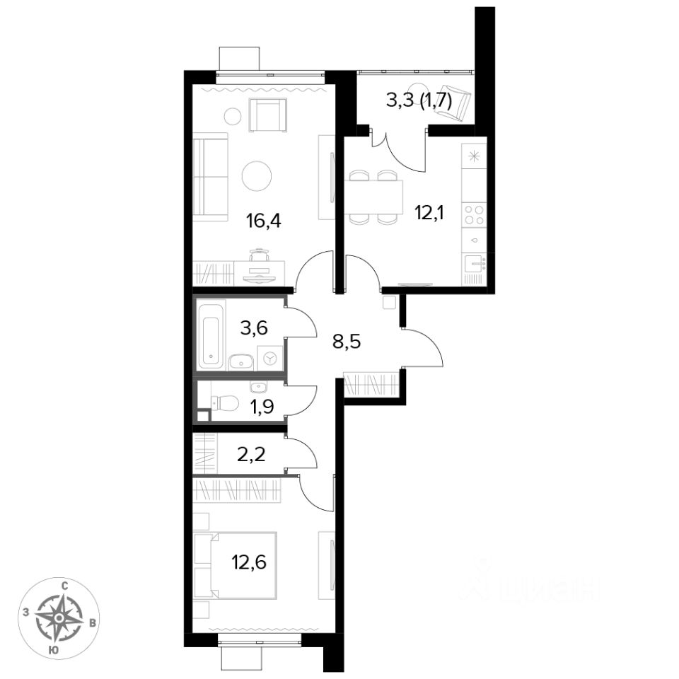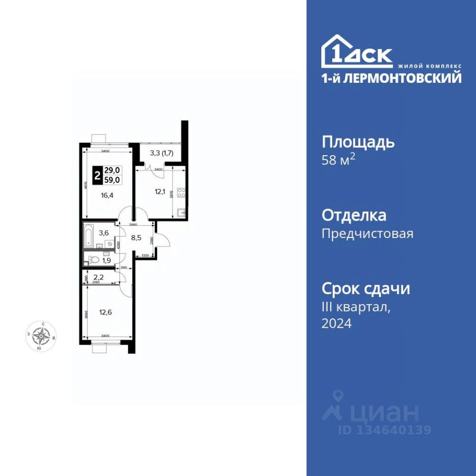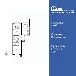 Продаётся 2-к квартира номер 469 общей площадью 58.9 кв.м. на 9-м этаже 24 этажного здания. Отделка Whitebox.