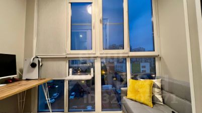 Балкон функционально обустроен как рабочая зона с раскладывающимся диваном, что добавляет полезную площадь и может служить местом для работы или отдыха.