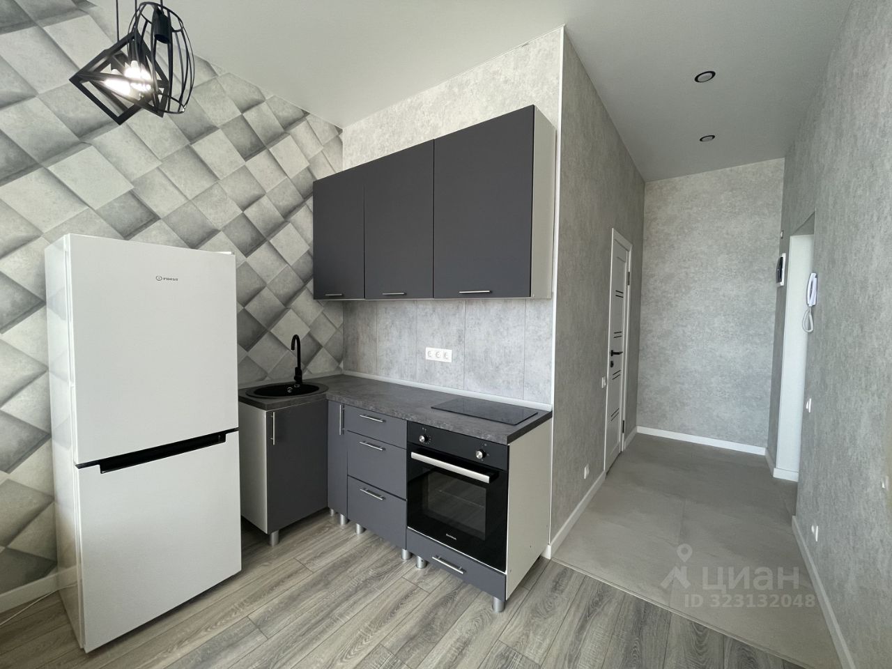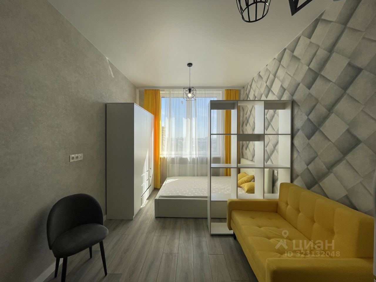 Студия укомплектована мебелью и техникой: в комнате двуспальная кровать, шкаф для одежды, раскладной диван, кухонный гарнитур с электрической плитой, духовым шкафом, холодильником, совмещенный санузел с ванной и стиральной машиной.