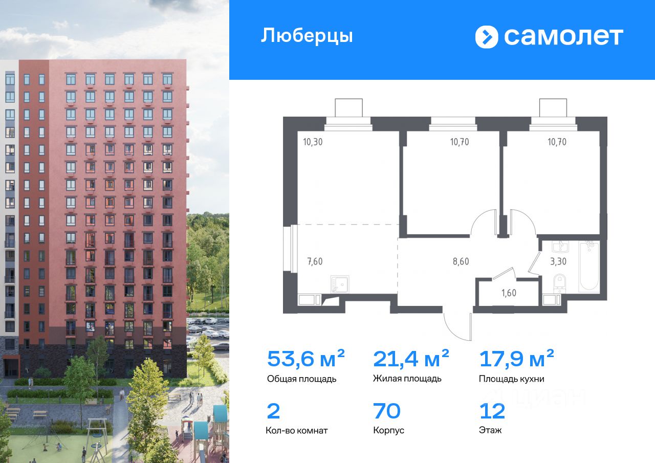 Строим кварталы для жизни с заботой о будущем. Предлагаются 2-комнатные апартаменты комфорт-класса 53,6 кв.м в корпусе 70 на 12 этаже, в "Люберцы"
