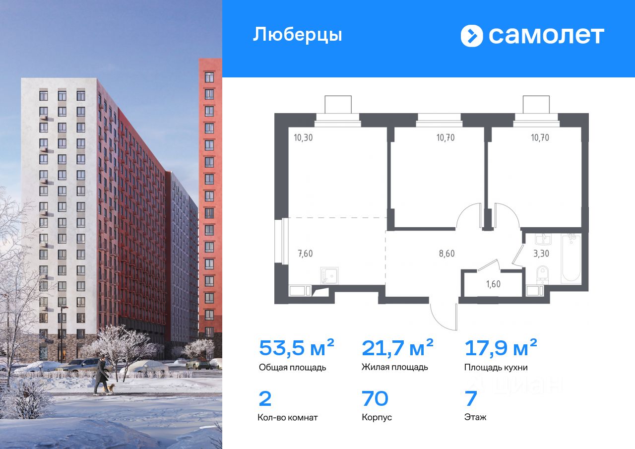 Строим кварталы для жизни с заботой о будущем. Предлагаются 2-комнатные апартаменты комфорт-класса 53,5 кв.м в корпусе 70 на 7 этаже, в "Люберцы"