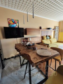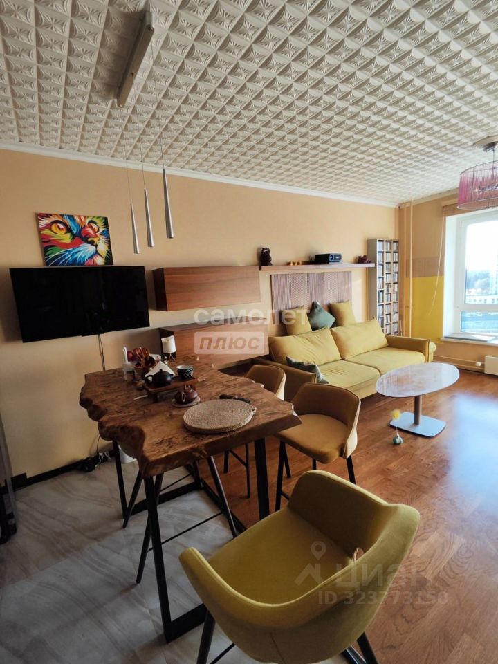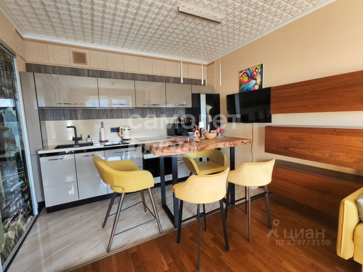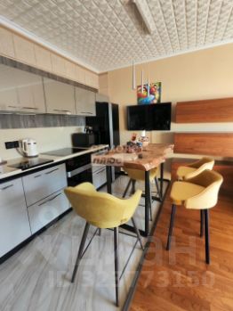 Кухня-гостиная: кухня от "Немецких кухонь", техника ORA-ITO от Gorenja, полубарный стол из слэба карагача, 4 стула, телевизор. В зоне гостиной комплект корпусной мебели BoConcept, диван, пуф, журнальный стол, система домашнего кинотеатра с проектором и экраном 3 метра, шумоизоляция потолка и "плавающий" пол с паркетной доской.