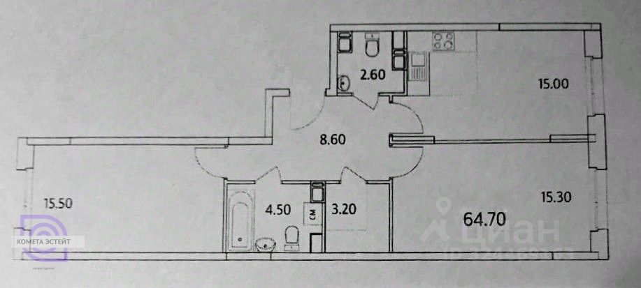 Продается просторная Евро-3-х комнатная квартира 64.7 м² в ЖК "Облака 2.0" без отделки.