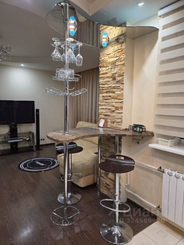 В квартире большая комфортная гостиная с барным столиком, отделяющим кухонную зону с выходом на остеклённую лоджию. Изолированная спальная комната с выходом на вторую остекленную лоджию, которую можно использовать под рабочее место-кабинет.