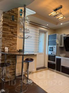 Потолки многоуровневые, высокие, с комбинированным освещением. Полы- плитка, ламинат. Качественная сантехника и встроенная кухонная техника. Раздельный санузел отделан плиткой, установлен бойлер.