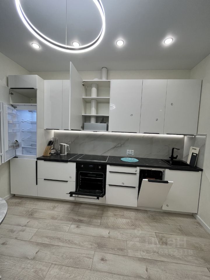 Имеется кухонный гарнитур со встроенной бытовой техникой - варочная панель, духовой шкаф, вытяжка, посудомоечная машинка, встроенный холодильник.