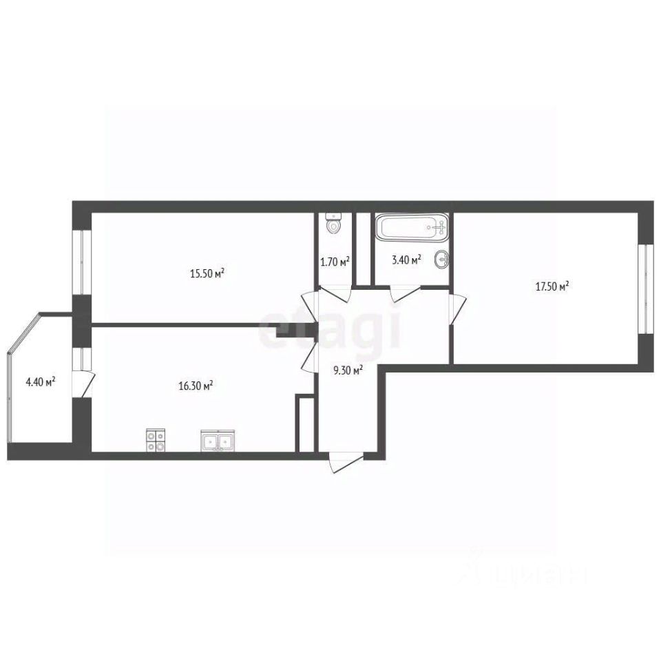 - 2-к квартира 63,5 м2/ кухня 16,3 м2/ жилая 33 м2/ комнаты 15,5 и 17,5 м2