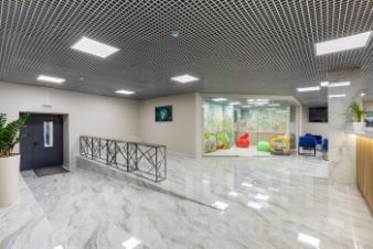 - В холле расположено лобби со стойкой ресепшн и лаунж зоны. При входе предусмотрено место хранения детского транспорта и колясок