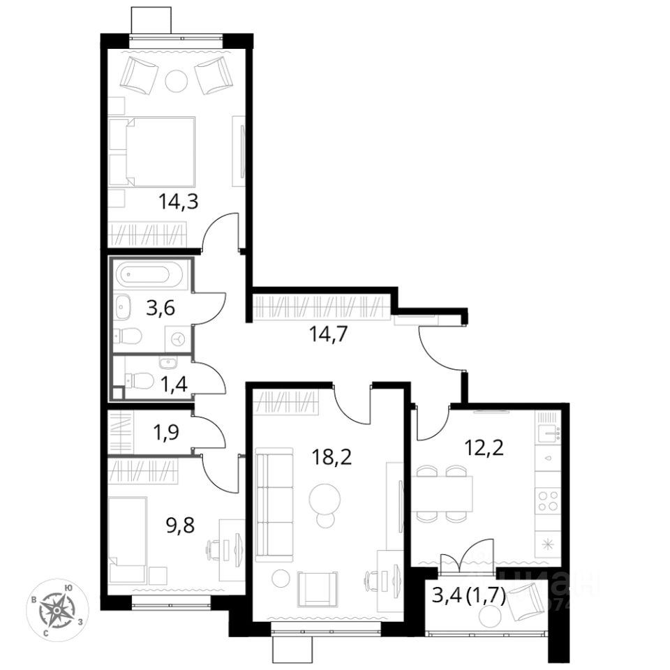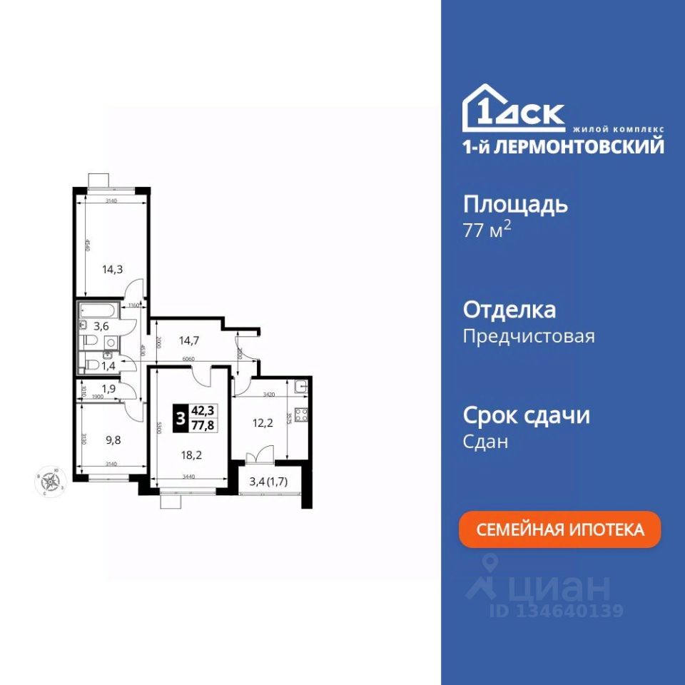 Продаётся 3-к квартира номер 153 общей площадью 77.8 кв.м. на 17-м этаже 24 этажного здания. Отделка Whitebox. Цена с учётом скидки.