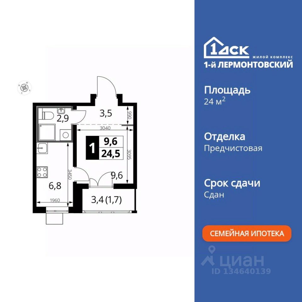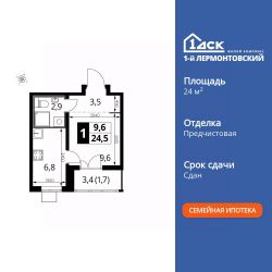 Продаётся квартира-студия номер 582 общей площадью 24.7 кв.м. на 6-м этаже 25 этажного здания. Предчистовая отделка. Цена с учётом скидки.