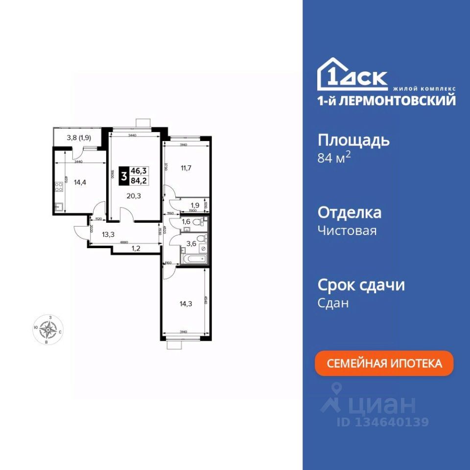 Продаётся 3-к квартира номер 104 общей площадью 84.2 кв.м. на 16-м этаже 24 этажного здания. Чистовая отделка. Цена с учётом скидки.
