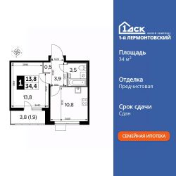 Продаётся 1-к квартира номер 777 общей площадью 34.3 кв.м. на 21-м этаже 25 этажного здания. Предчистовая отделка. Цена с учётом скидки.