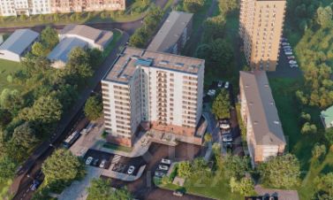 Дом располагается в г. Люберцы на пересечении улиц 8 Марта и 3-го Интернационала, в 380 м от Наташинского парка и прудов. Стадия строительства высокая: каркас дома полностью возведен, идет облицовка дома вентилируемым фасадом.