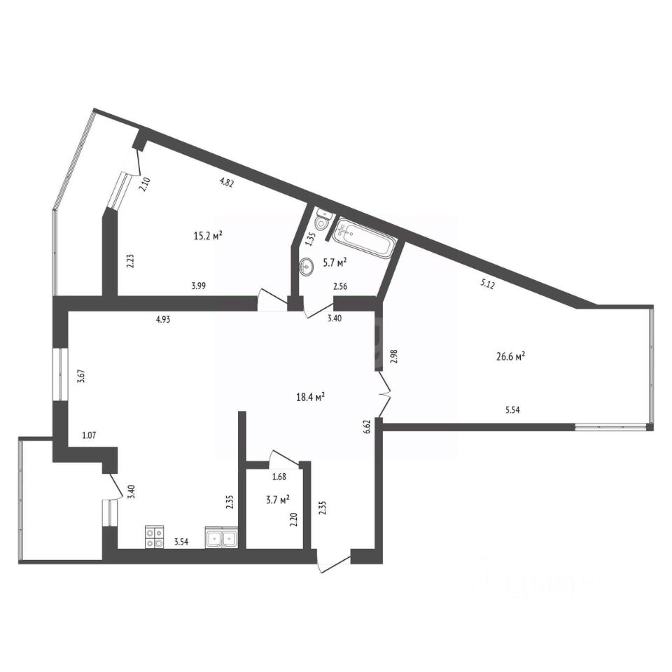 Общая площадь 98,6 кв.м. без учёта лоджий.