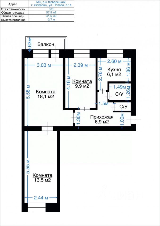 57,5 м²