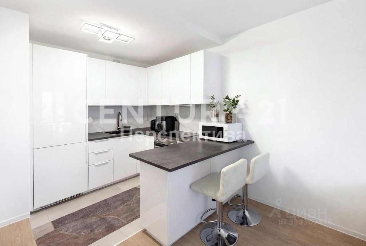 Светлая квартира с большой кухней-гостиной и спальной комнатой.
