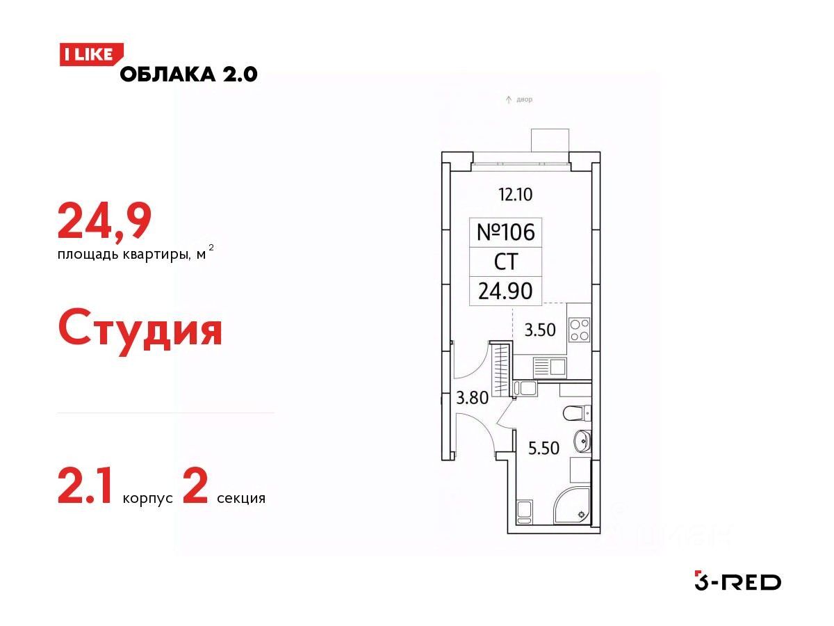 Продается студия(Корпус 2.1) общей площадью 24,9 кв.м на 4 этаже.