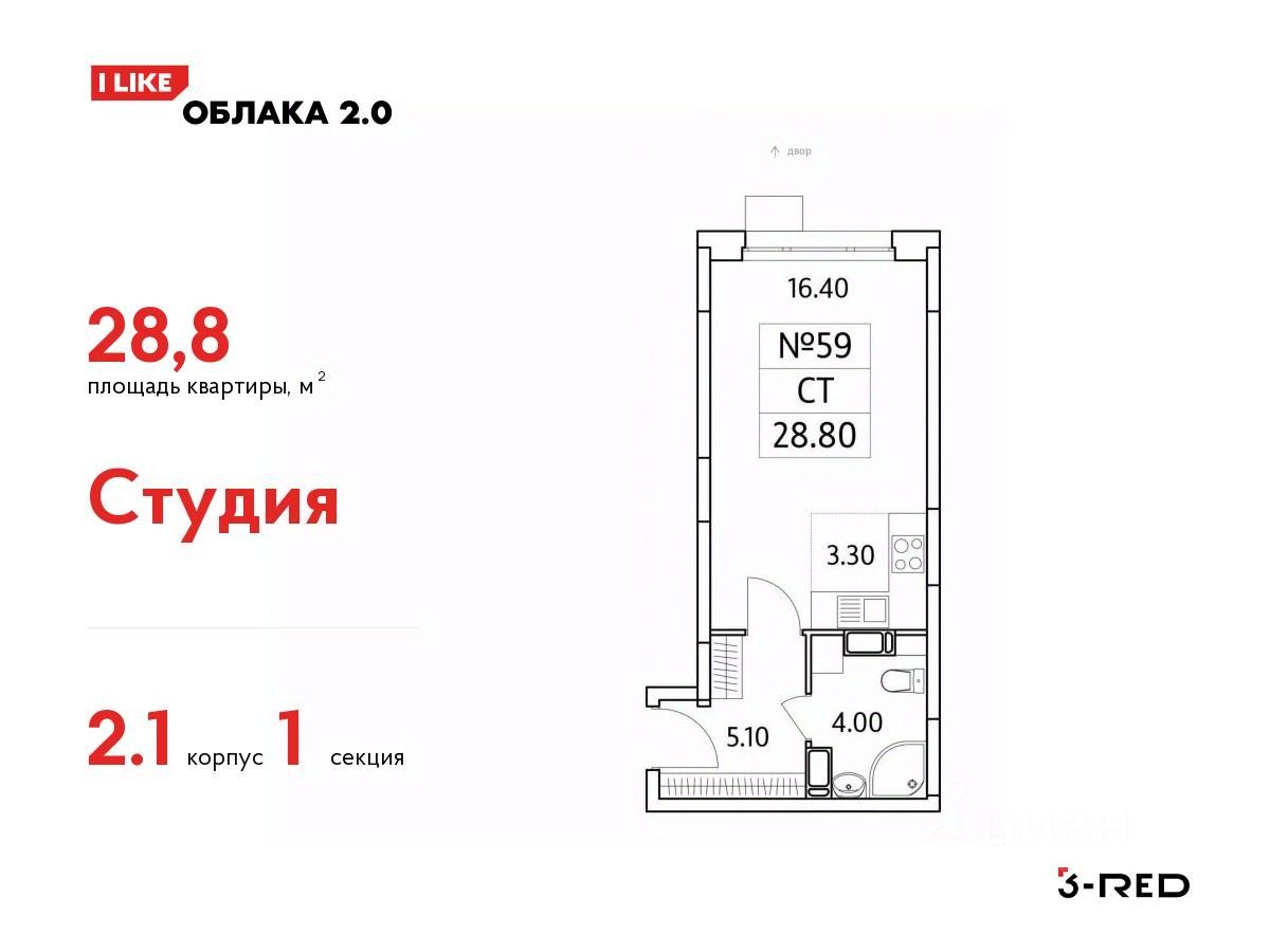 Продается студия(Корпус 2.1) общей площадью 28,8 кв.м на 9 этаже.