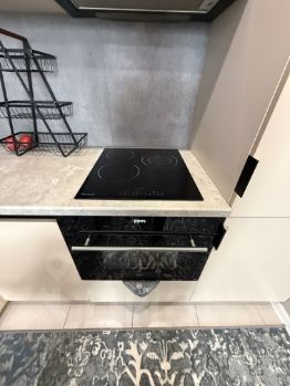 Кухня в отличном состоянии со встроенным холодильником, духовым шкафом и варочной поверхностью.