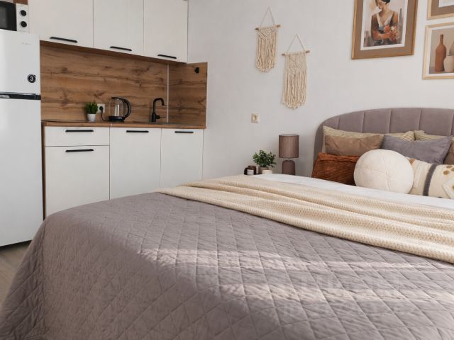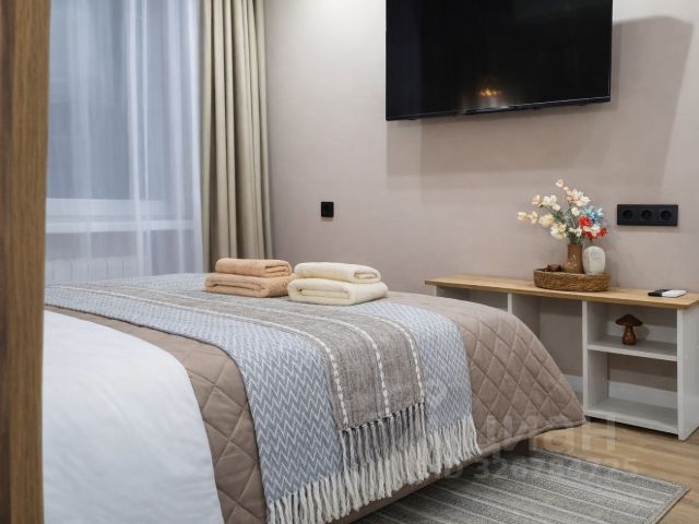 Новая удобная двуспальная кровать , небольшой диванчик для отдыха. В квартире с комфортом могут разместиться до 2-х человек